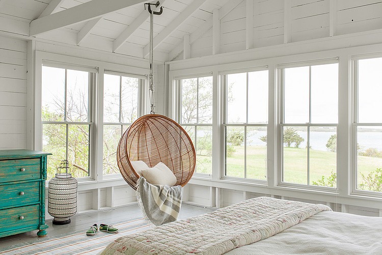 Una apuesta por el blanco con un toque de color, buena inspiración para una pequeña cabaña.